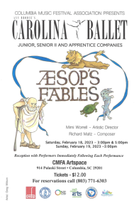 The Junior members of Ann Brodie’s CAROLINA BALLET take the stage at the CMFA Artspace to present this unique work specifically commissioned for Ann Brodie’s Carolina Ballet. Working closely with Artistic Director, Mimi Worrell, acclaimed composer Dr. Richard Maltz wrote the music specially for this staging. His composition was performed live during the first production conducted by Maltz himself. The selected stories interpret morals. They become teaching tools for children in short performances designed to keep them interested throughout. Noted character actor, Cory Summerall will reprise his role as Aesop. Members of the Senior Company will join the Juniors in the prologue portraying Apollo and his three Muses. A small reception to meet the cast will follow each production.